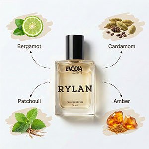 RYLAN perfume opens with a crisp burst of grapefruit and mandarin orange. These citrus notes feel refreshing and energetic. Additionally, a subtle gin accord adds a cool aromatic twist that makes the opening unique. As the fragrance develops, warm spices slowly appear. Black pepper and cardamom create a refined yet lively heart. Moreover, juniper brings a smooth aromatic layer that keeps the scent modern and balanced. Finally, the base settles into earthy vetiver, cedarwood, and patchouli. Amber adds warmth and depth. Therefore, the dry down feels smooth, confident, and long lasting.