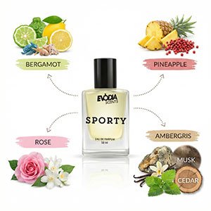 SPORTY perfume begins with an energetic splash of citrus and juicy fruits. Bergamot, lemon, and pineapple create a refreshing start that feels clean and uplifting. Additionally, hints of mandarin and marine notes add a cool aquatic touch that enhances the sporty character. As the fragrance develops, soft florals like rose, jasmine, and lily of the valley appear. These notes bring elegance while keeping the scent light and fresh. Finally, the base settles into warm cedarwood, patchouli, and musk. Therefore, the dry down feels smooth, masculine, and long-lasting without being overpowering.